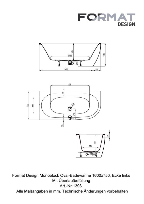 | FO05080320001 | FORMAT Design Acryl-Badewanne | 160 x 75 cm, weiß, Ecke links, mit Zu-, Ab- und Überlaufgarnitur |